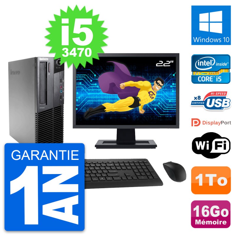 PC Lenovo M82 SFF - Intel Core i5-3470 3.2 Ghz (6 Mo) - 16 Go DDR3 - Disque Dur 3,5" 1 To - Graveur DVD - Clef Wifi USB - Windows 10 - Livré avec Ecran 22" + clavier + souris (Marques et modèles variables) - Garantie 1 an.