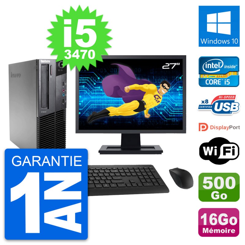 PC Lenovo M82 SFF - Intel Core i5-3470 3.2 Ghz (6 Mo) - 16 Go DDR3 - Disque Dur 3,5" 500 Go - Graveur DVD - Clef Wifi USB - Windows 10 - Livré avec Ecran 27" + clavier + souris (Marques et modèles variables) - Garantie 1 an.