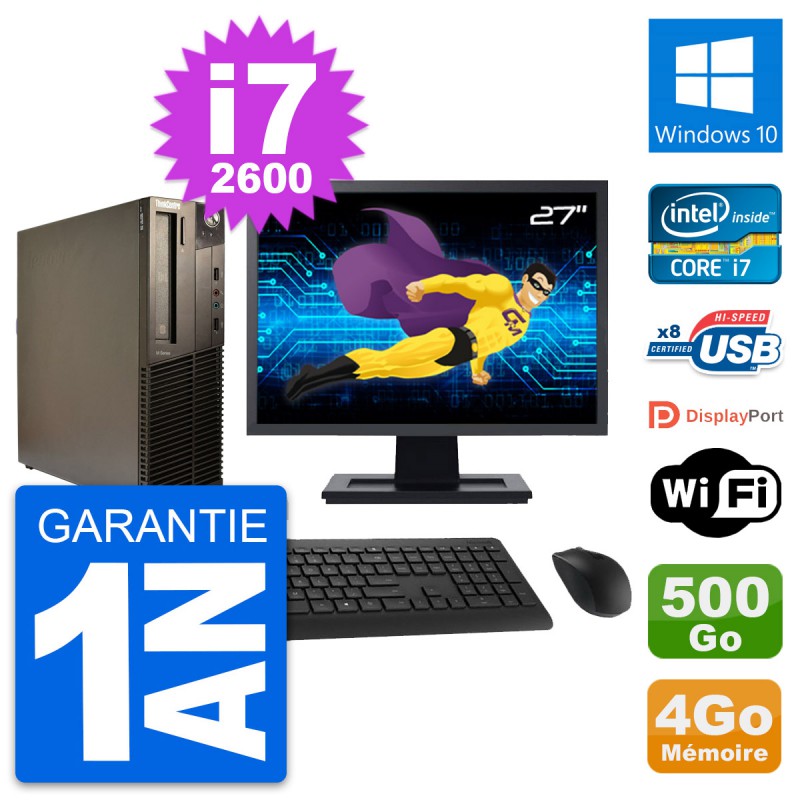 PC Lenovo M82 SFF - Intel Core i7-2600 3.4 Ghz (8 Mo) - 4 Go DDR3 - Disque Dur 3,5" 500 Go - Graveur DVD - Clef Wifi USB - Windows 10 - Livré avec Ecran 27" + clavier + souris (Marques et modèles variables) - Garantie 1 an.