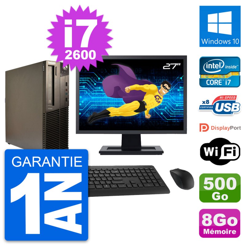 PC Lenovo M82 SFF - Intel Core i7-2600 3.4 Ghz (8 Mo) - 8 Go DDR3 - Disque Dur 3,5" 500 Go - Graveur DVD - Clef Wifi USB - Windows 10 - Livré avec Ecran 27" + clavier + souris (Marques et modèles variables) - Garantie 1 an.