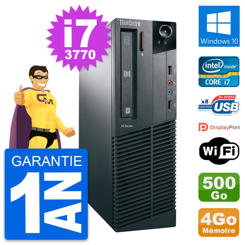 PC Lenovo ThinkCentre M82 SFF - Intel Core i7-3770 3.4 Ghz (8 Mo) - 4 Go DDR3 - Disque Dur 3,5" 500 Go - Graveur DVD - Clef Wifi USB - Windows 10 - Garantie 1 an.