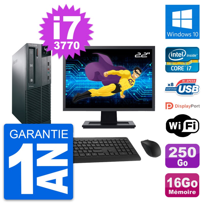 PC Lenovo M82 SFF - Intel Core i7-3770 3.4 Ghz (8 Mo) - 16 Go DDR3 - Disque Dur 3,5" 250 Go - Graveur DVD - Clef Wifi USB - Windows 10 - Livré avec Ecran 22" + clavier + souris (Marques et modèles variables) - Garantie 1 an.