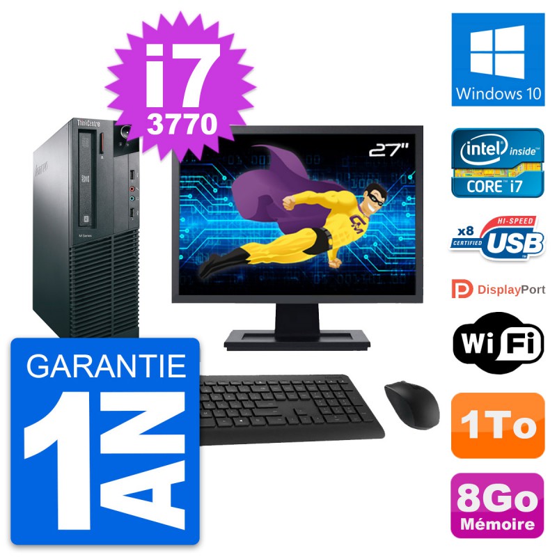 PC Lenovo M82 SFF - Intel Core i7-3770 3.4 Ghz (8 Mo) - 8 Go DDR3 - Disque Dur 3,5" 1 To - Graveur DVD - Clef Wifi USB - Windows 10 - Livré avec Ecran 27" + clavier + souris (Marques et modèles variables) - Garantie 1 an.