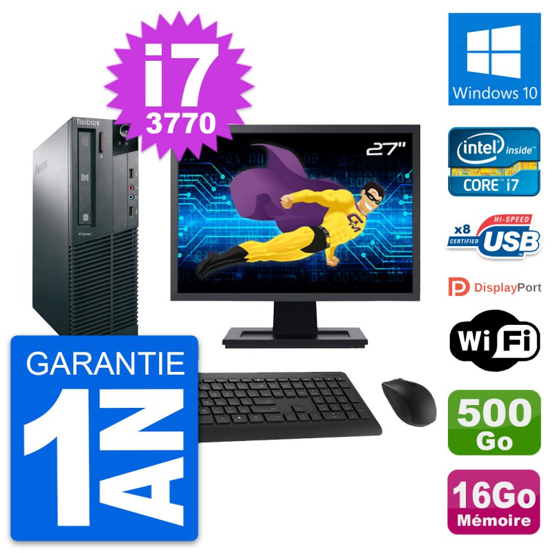 PC Lenovo M82 SFF - Intel Core i7-3770 3.4 Ghz (8 Mo) - 16 Go DDR3 - Disque Dur 3,5" 500 Go - Graveur DVD - Clef Wifi USB - Windows 10 - Livré avec Ecran 27" + clavier + souris (Marques et modèles variables) - Garantie 1 an.