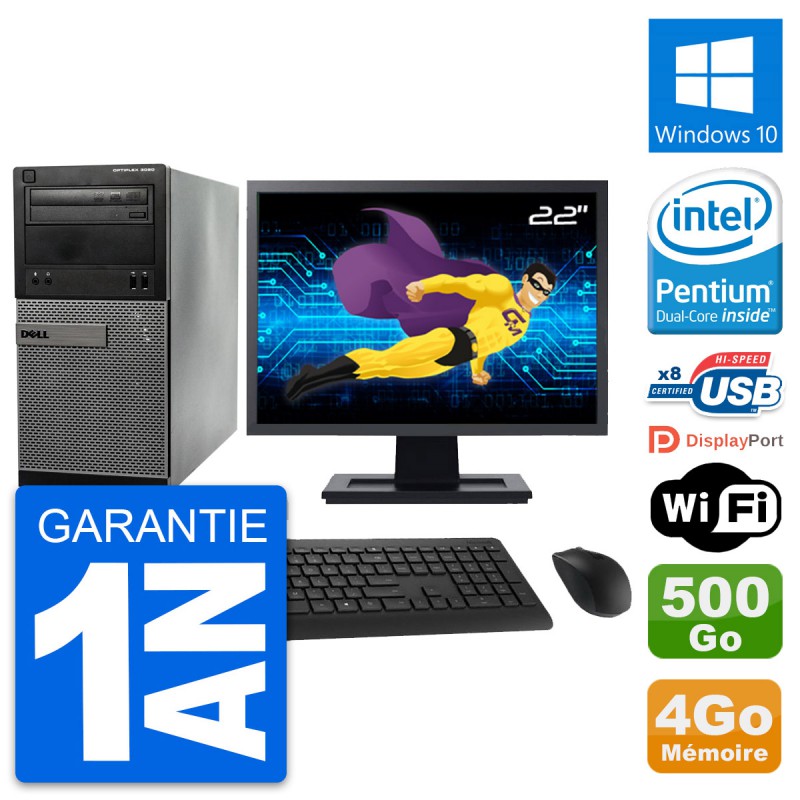 PC Tour Dell 3020 SFF - Intel Pentium G3220 3.0 Ghz (3 Mo) - 4 Go DDR3 - Disque Dur 3,5" 500 Go - Graveur DVD - Clef Wifi USB - Windows 10 - Livré avec Ecran 22" + clavier + souris (Marques et modèles variables) - Garantie 1 an.