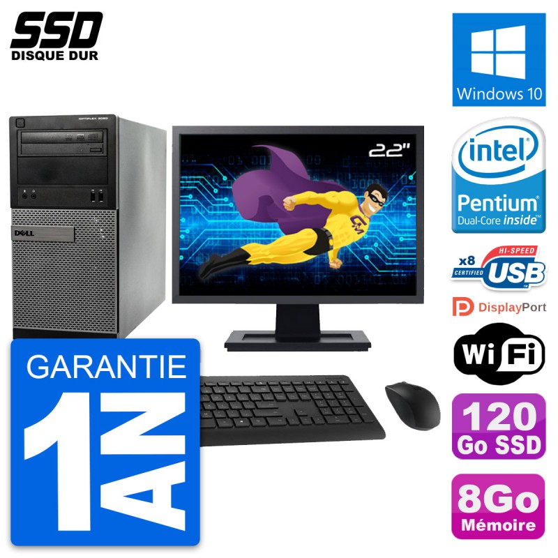 PC Tour Dell 3020 SFF - Intel Pentium G3220 3.0 Ghz (3 Mo) - 8 Go DDR3 - Disque Dur SSD 120 Go - Graveur DVD - Clef Wifi USB - Windows 10 - Livré avec Ecran 22" + clavier + souris (Marques et modèles variables) - Garantie 1 an.