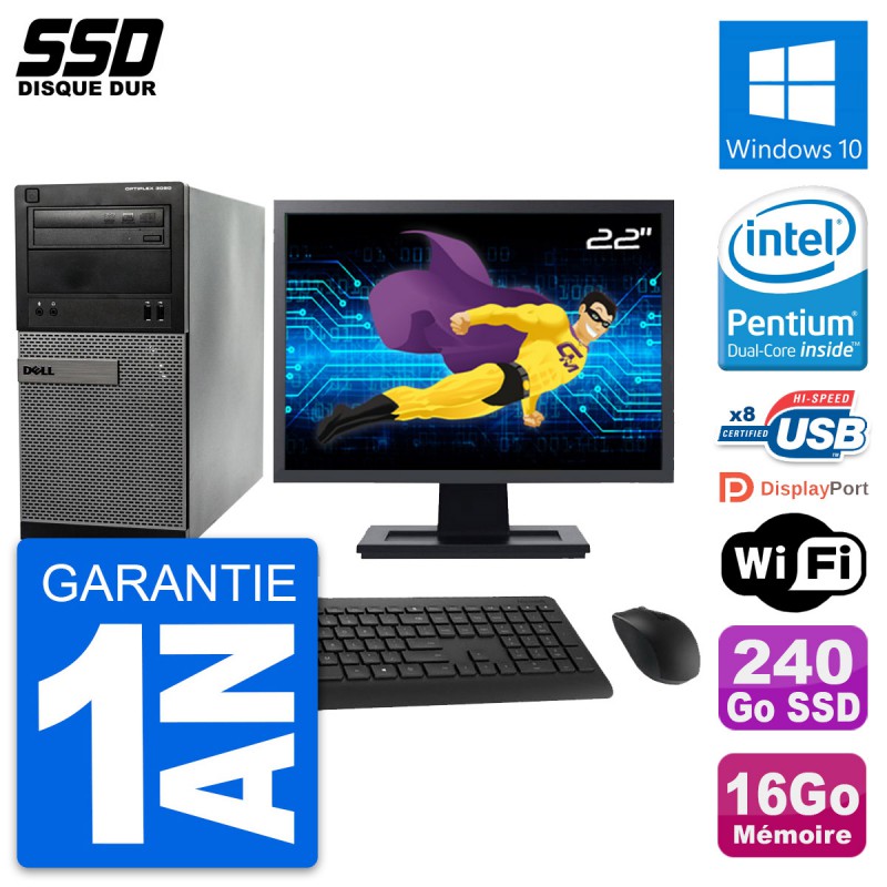 PC Tour Dell 3020 SFF - Intel Pentium G3220 3.0 Ghz (3 Mo) - 16 Go DDR3 - Disque Dur SSD 240 Go - Graveur DVD - Clef Wifi USB - Windows 10 - Livré avec Ecran 22" + clavier + souris (Marques et modèles variables) - Garantie 1 an.