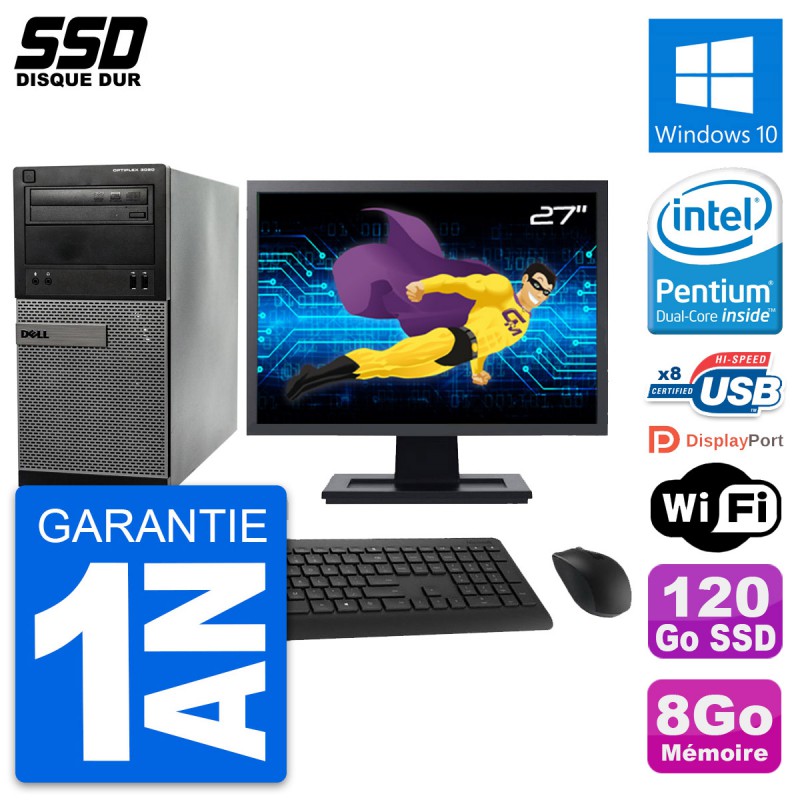 PC Tour Dell 3020 SFF - Intel Pentium G3220 3.0 Ghz (3 Mo) - 8 Go DDR3 - Disque Dur SSD 120 Go - Graveur DVD - Clef Wifi USB - Windows 10 - Livré avec Ecran 27" + clavier + souris (Marques et modèles variables) - Garantie 1 an.