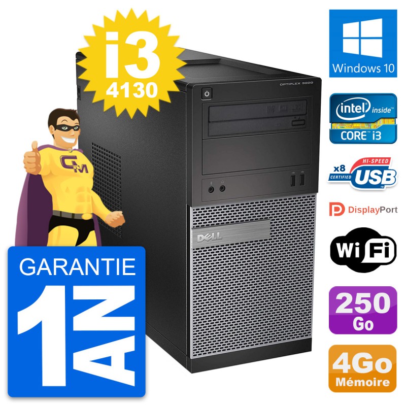 PC Tour Dell OptiPlex 3020 - Intel Core i3-4130 3.4 Ghz (3 Mo) - 4 Go DDR3 - Disque Dur 3,5" 250 Go - Graveur DVD - Clef Wifi USB - Windows 10 - Garantie 1 an.