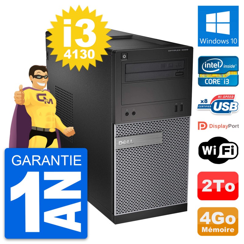 PC Tour Dell OptiPlex 3020 - Intel Core i3-4130 3.4 Ghz (3 Mo) - 4 Go DDR3 - Disque Dur 3,5" 2 To - Graveur DVD - Clef Wifi USB - Windows 10 - Garantie 1 an.