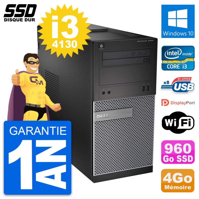 PC Tour Dell OptiPlex 3020 - Intel Core i3-4130 3.4 Ghz (3 Mo) - 4 Go DDR3 - Disque Dur SSD 960 Go - Graveur DVD - Clef Wifi USB - Windows 10 - Garantie 1 an.