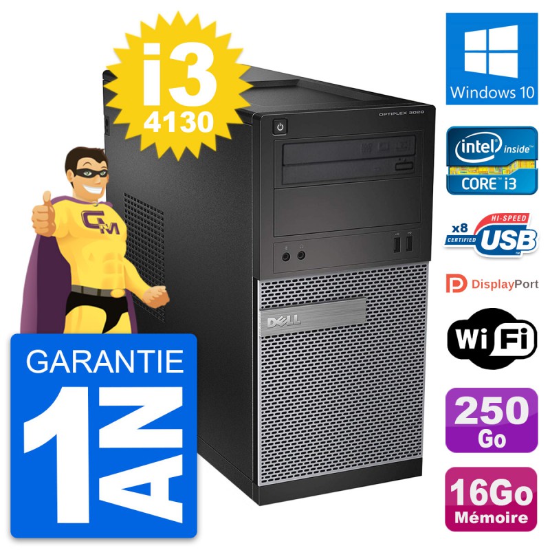 PC Tour Dell OptiPlex 3020 - Intel Core i3-4130 3.4 Ghz (3 Mo) - 16 Go DDR3 - Disque Dur 3,5" 250 Go - Graveur DVD - Clef Wifi USB - Windows 10 - Garantie 1 an.