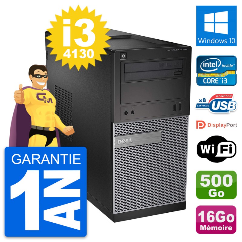 PC Tour Dell OptiPlex 3020 - Intel Core i3-4130 3.4 Ghz (3 Mo) - 16 Go DDR3 - Disque Dur 3,5" 500 Go - Graveur DVD - Clef Wifi USB - Windows 10 - Garantie 1 an.