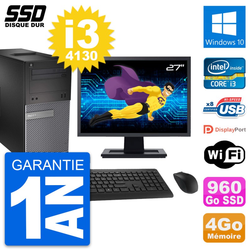 PC Tour Dell 3020 SFF - Intel Core i3-4130 3.4 Ghz (3 Mo) - 4 Go DDR3 - Disque Dur SSD 960 Go - Graveur DVD - Clef Wifi USB - Windows 10 - Livré avec Ecran 27" + clavier + souris (Marques et modèles variables) - Garantie 1 an.