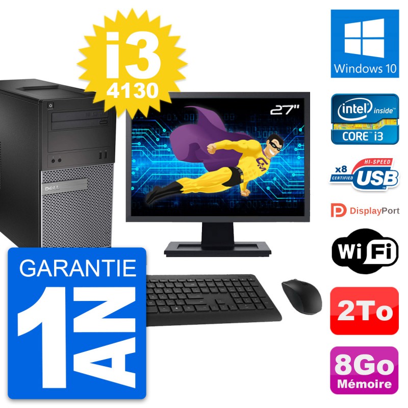 PC Tour Dell 3020 SFF - Intel Core i3-4130 3.4 Ghz (3 Mo) - 8 Go DDR3 - Disque Dur 3,5" 2 To - Graveur DVD - Clef Wifi USB - Windows 10 - Livré avec Ecran 27" + clavier + souris (Marques et modèles variables) - Garantie 1 an.