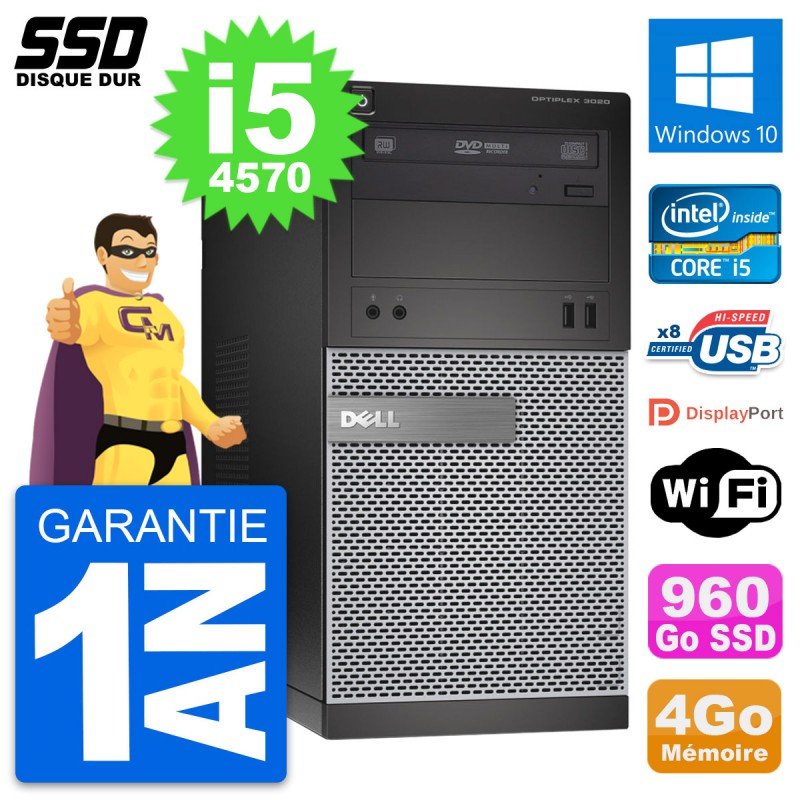 PC Tour Dell OptiPlex 3020 - Intel Core i5-4570 3.2 Ghz (6 Mo) - 4 Go DDR3 - Disque Dur SSD 960 Go - Graveur DVD - Clef Wifi USB - Windows 10 - Garantie 1 an.