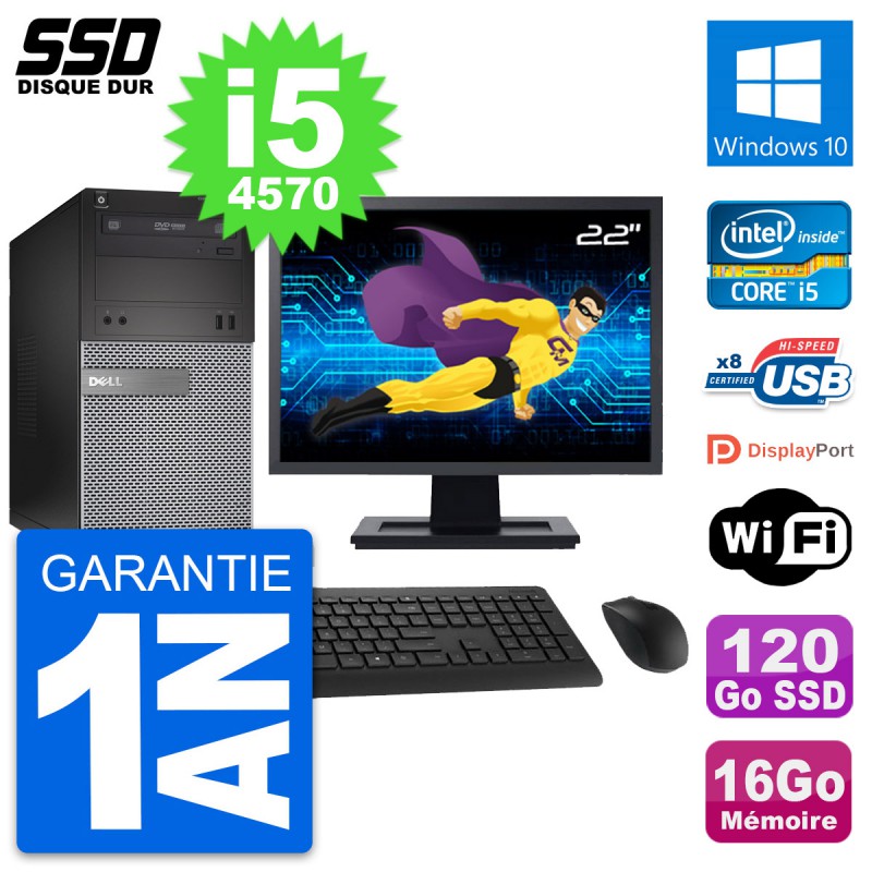 PC Tour Dell 3020 SFF - Intel Core i5-4570 3.2 Ghz (6 Mo) - 16 Go DDR3 - Disque Dur SSD 120 Go - Graveur DVD - Clef Wifi USB - Windows 10 - Livré avec Ecran 22" + clavier + souris (Marques et modèles variables) - Garantie 1 an.