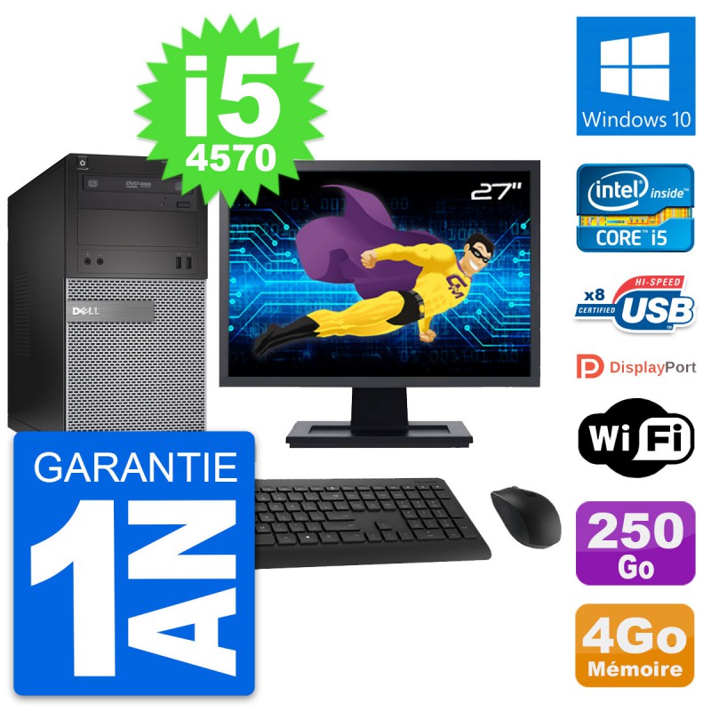 PC Tour Dell 3020 SFF - Intel Core i5-4570 3.2 Ghz (6 Mo) - 4 Go DDR3 - Disque Dur 3,5" 250 Go - Graveur DVD - Clef Wifi USB - Windows 10 - Livré avec Ecran 27" + clavier + souris (Marques et modèles variables) - Garantie 1 an.