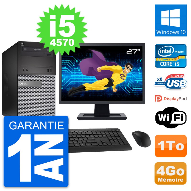 PC Tour Dell 3020 SFF - Intel Core i5-4570 3.2 Ghz (6 Mo) - 4 Go DDR3 - Disque Dur 3,5" 1 To - Graveur DVD - Clef Wifi USB - Windows 10 - Livré avec Ecran 27" + clavier + souris (Marques et modèles variables) - Garantie 1 an.