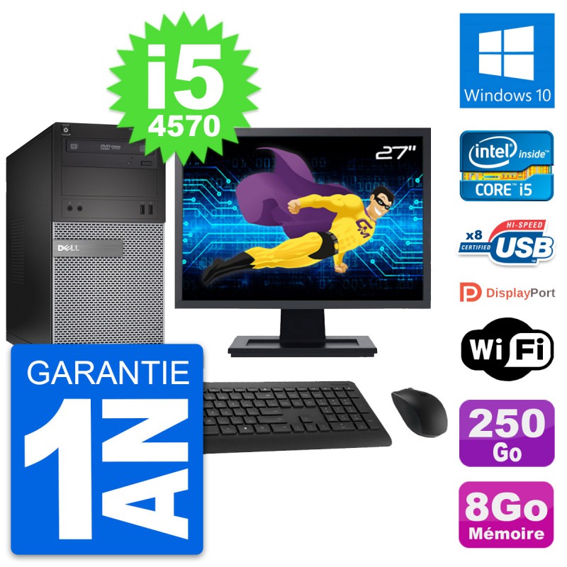 PC Tour Dell 3020 SFF - Intel Core i5-4570 3.2 Ghz (6 Mo) - 8 Go DDR3 - Disque Dur 3,5" 250 Go - Graveur DVD - Clef Wifi USB - Windows 10 - Livré avec Ecran 27" + clavier + souris (Marques et modèles variables) - Garantie 1 an.