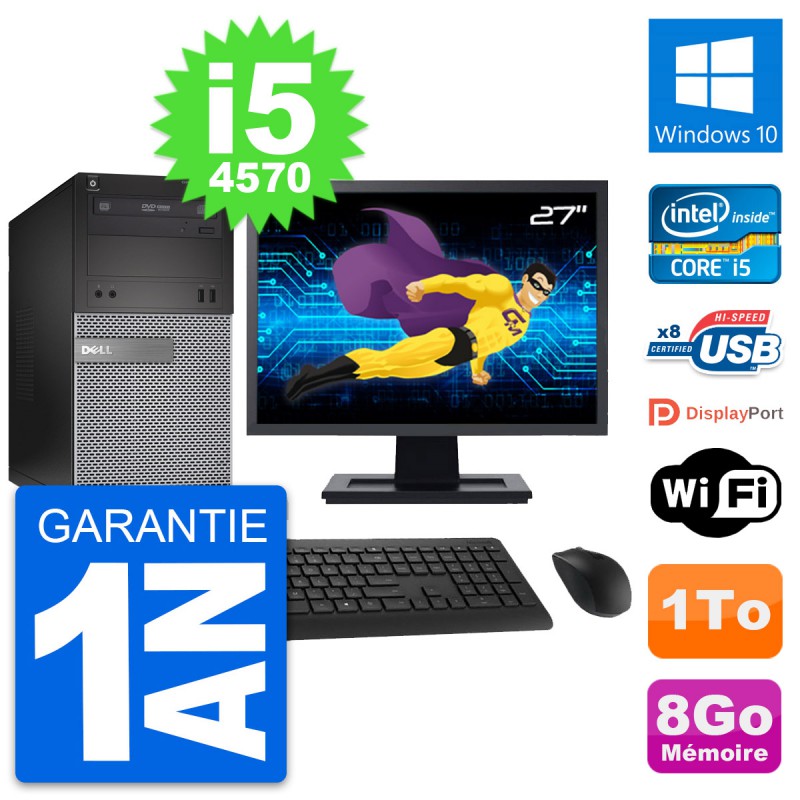 PC Tour Dell 3020 SFF - Intel Core i5-4570 3.2 Ghz (6 Mo) - 8 Go DDR3 - Disque Dur 3,5" 1 To - Graveur DVD - Clef Wifi USB - Windows 10 - Livré avec Ecran 27" + clavier + souris (Marques et modèles variables) - Garantie 1 an.