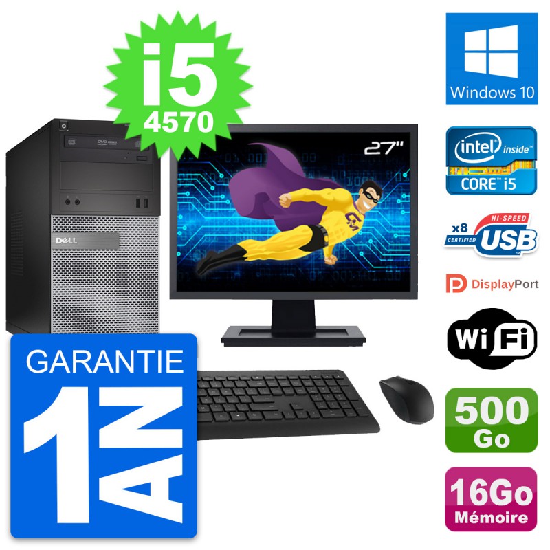 PC Tour Dell 3020 SFF - Intel Core i5-4570 3.2 Ghz (6 Mo) - 16 Go DDR3 - Disque Dur 3,5" 500 Go - Graveur DVD - Clef Wifi USB - Windows 10 - Livré avec Ecran 27" + clavier + souris (Marques et modèles variables) - Garantie 1 an.