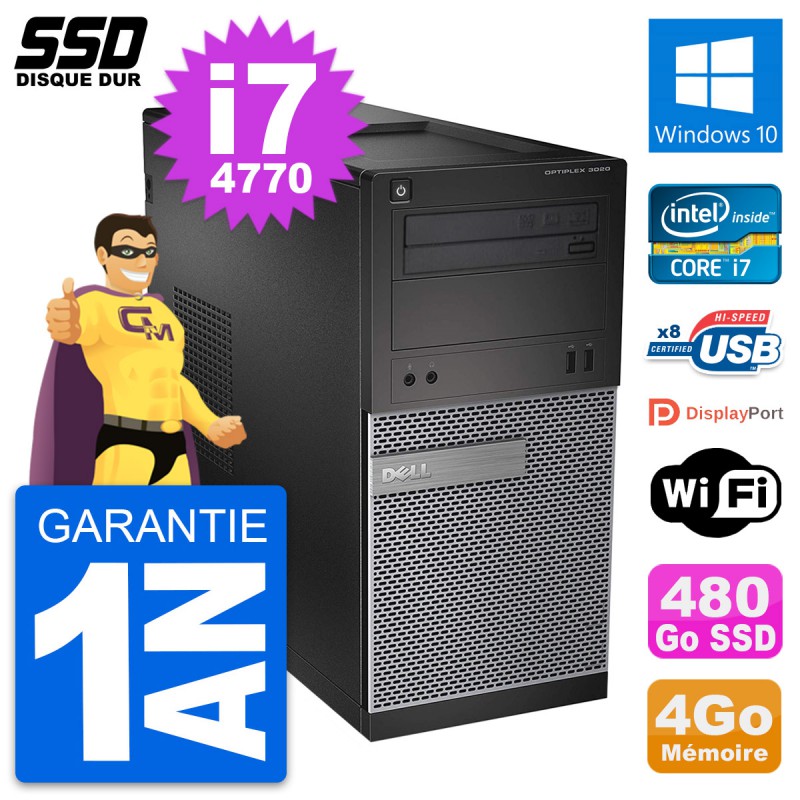PC Tour Dell OptiPlex 3020 - Intel Core i7-4770 3.4 Ghz (8 Mo) - 4 Go DDR3 - Disque Dur SSD 480 Go - Graveur DVD - Clef Wifi USB - Windows 10 - Garantie 1 an.