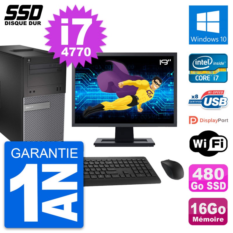 PC Tour Dell 3020 SFF - Intel Core i7-4770 3.4 Ghz (8 Mo) - 16 Go DDR3 - Disque Dur SSD 480 Go - Graveur DVD - Clef Wifi USB - Windows 10 - Livré avec Ecran 19" + clavier + souris (Marques et modèles variables) - Garantie 1 an.