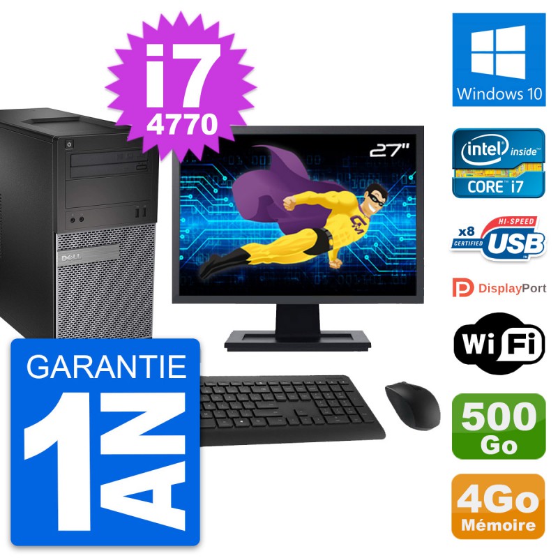 PC Tour Dell 3020 SFF - Intel Core i7-4770 3.4 Ghz (8 Mo) - 4 Go DDR3 - Disque Dur 3,5" 500 Go - Graveur DVD - Clef Wifi USB - Windows 10 - Livré avec Ecran 27" + clavier + souris (Marques et modèles variables) - Garantie 1 an.