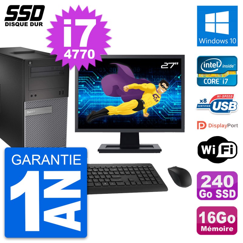 PC Tour Dell 3020 SFF - Intel Core i7-4770 3.4 Ghz (8 Mo) - 16 Go DDR3 - Disque Dur SSD 240 Go - Graveur DVD - Clef Wifi USB - Windows 10 - Livré avec Ecran 27" + clavier + souris (Marques et modèles variables) - Garantie 1 an.