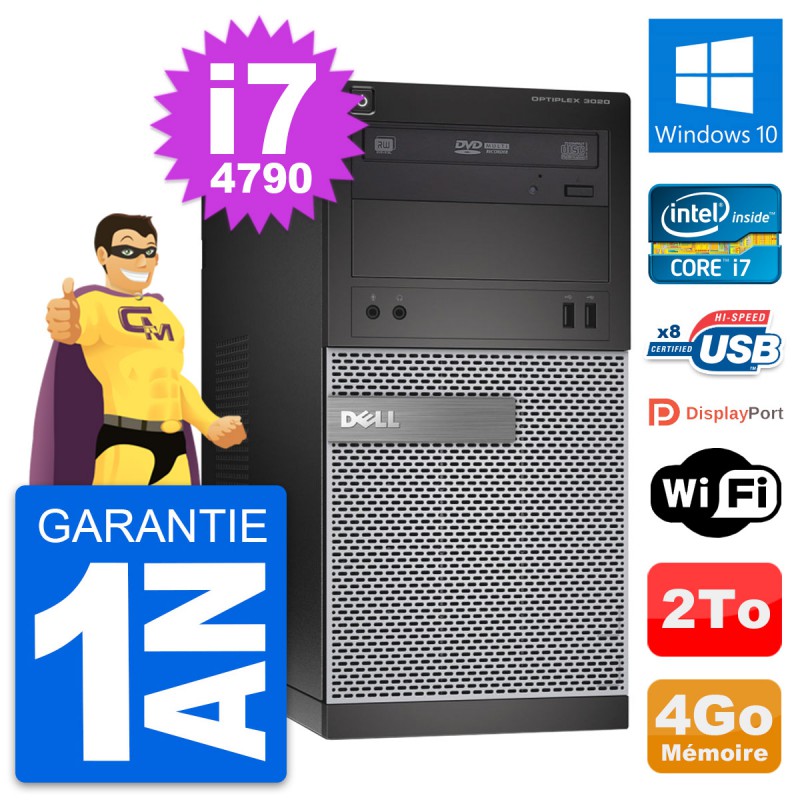 PC Tour Dell OptiPlex 3020 - Intel Core i7-4790 3.6 Ghz (8 Mo) - 4 Go DDR3 - Disque Dur 3,5" 2 To - Graveur DVD - Clef Wifi USB - Windows 10 - Garantie 1 an.