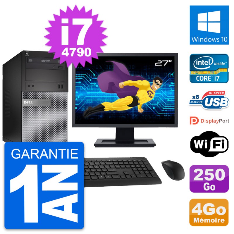 PC Tour Dell 3020 SFF - Intel Core i7-4790 3.6 Ghz (8 Mo) - 4 Go DDR3 - Disque Dur 3,5" 250 Go - Graveur DVD - Clef Wifi USB - Windows 10 - Livré avec Ecran 27" + clavier + souris (Marques et modèles variables) - Garantie 1 an.
