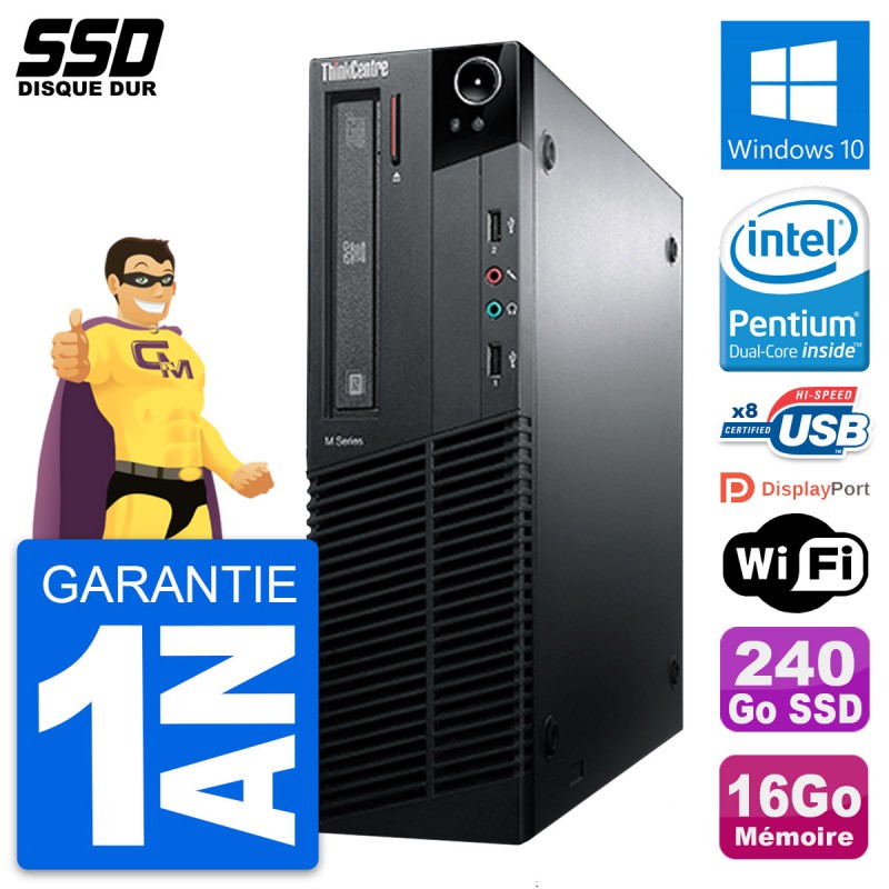 PC Lenovo ThinkCentre M81 SFF - Intel Pentium G630 2.7 Ghz (3 Mo) - 16 Go DDR3 - Disque Dur SSD 240 Go - Graveur DVD - Clef Wifi USB - Windows 10 - Garantie 1 an.