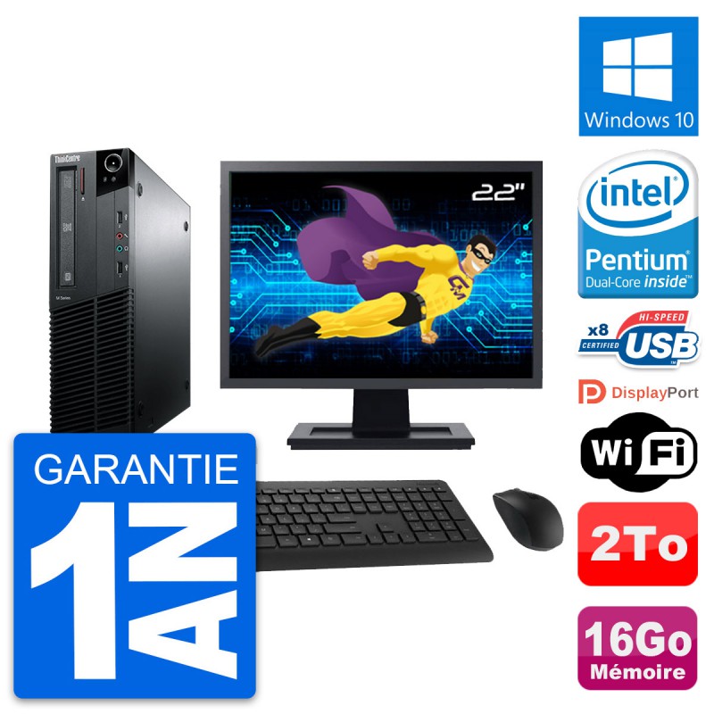 PC Lenovo M81 SFF - Intel Pentium G630 2.7 Ghz (3 Mo) - 16 Go DDR3 - Disque Dur 3,5" 2 To - Graveur DVD - Clef Wifi USB - Windows 10 - Livré avec Ecran 22" + clavier + souris (Marques et modèles variables) - Garantie 1 an.