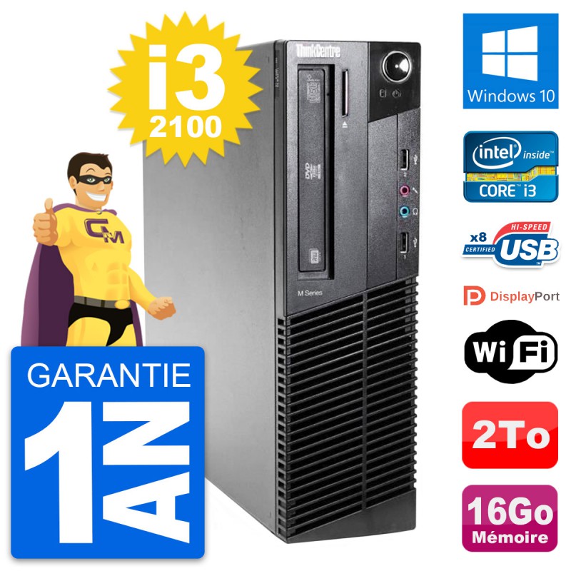 PC Lenovo ThinkCentre M81 SFF - Intel Core i3-2100 3.1 Ghz (3 Mo) - 16 Go DDR3 - Disque Dur 3,5" 2 To - Graveur DVD - Clef Wifi USB - Windows 10 - Garantie 1 an.