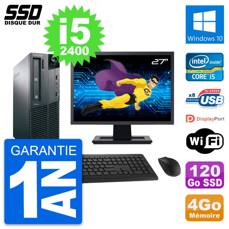 PC Lenovo M81 SFF - Intel Core i5-2400 3.1 Ghz (6 Mo) - 4 Go DDR3 - Disque Dur SSD 120 Go - Graveur DVD - Clef Wifi USB - Windows 10 - Livré avec Ecran 27" + clavier + souris (Marques et modèles variables) - Garantie 1 an.
