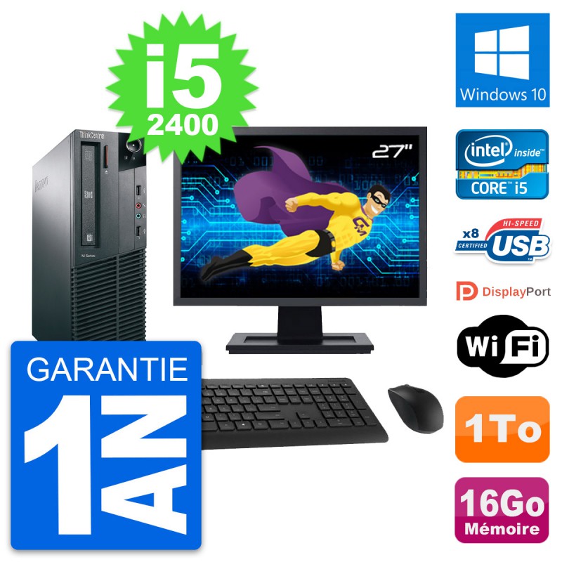 PC Lenovo M81 SFF - Intel Core i5-2400 3.1 Ghz (6 Mo) - 16 Go DDR3 - Disque Dur 3,5" 1 To - Graveur DVD - Clef Wifi USB - Windows 10 - Livré avec Ecran 27" + clavier + souris (Marques et modèles variables) - Garantie 1 an.
