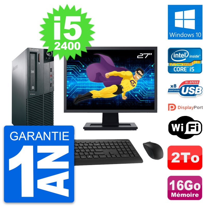 PC Lenovo M81 SFF - Intel Core i5-2400 3.1 Ghz (6 Mo) - 16 Go DDR3 - Disque Dur 3,5" 2 To - Graveur DVD - Clef Wifi USB - Windows 10 - Livré avec Ecran 27" + clavier + souris (Marques et modèles variables) - Garantie 1 an.