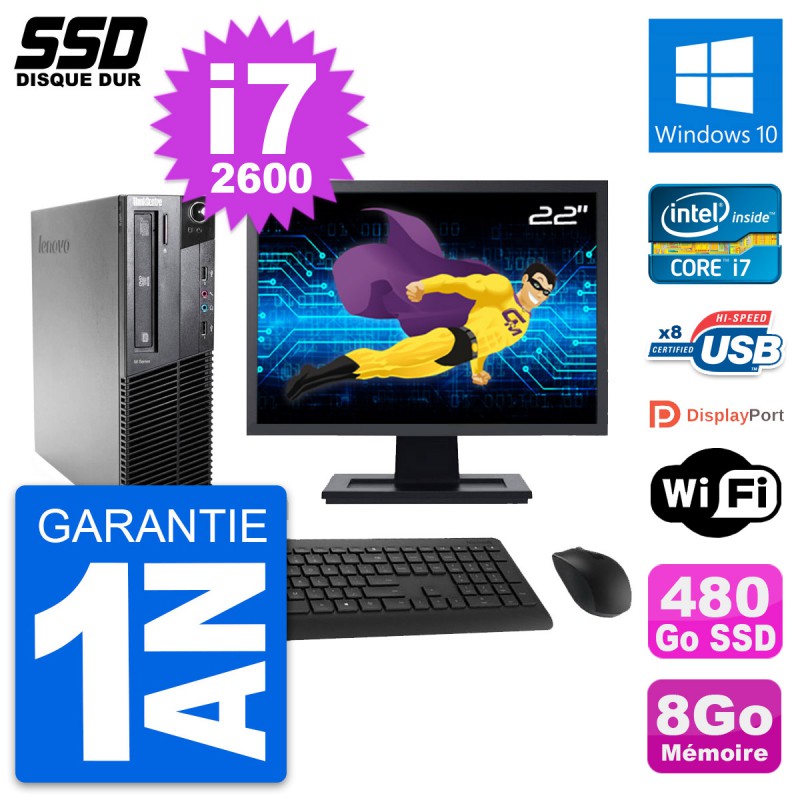 PC Lenovo M81 SFF - Intel Core i7-2600 3.4 Ghz (8 Mo) - 8 Go DDR3 - Disque Dur SSD 480 Go - Graveur DVD - Clef Wifi USB - Windows 10 - Livré avec Ecran 22" + clavier + souris (Marques et modèles variables) - Garantie 1 an.