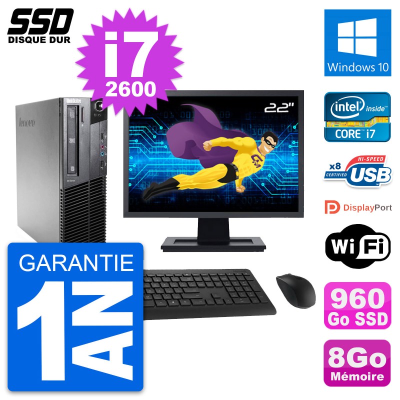 PC Lenovo M81 SFF - Intel Core i7-2600 3.4 Ghz (8 Mo) - 8 Go DDR3 - Disque Dur SSD 960 Go - Graveur DVD - Clef Wifi USB - Windows 10 - Livré avec Ecran 22" + clavier + souris (Marques et modèles variables) - Garantie 1 an.