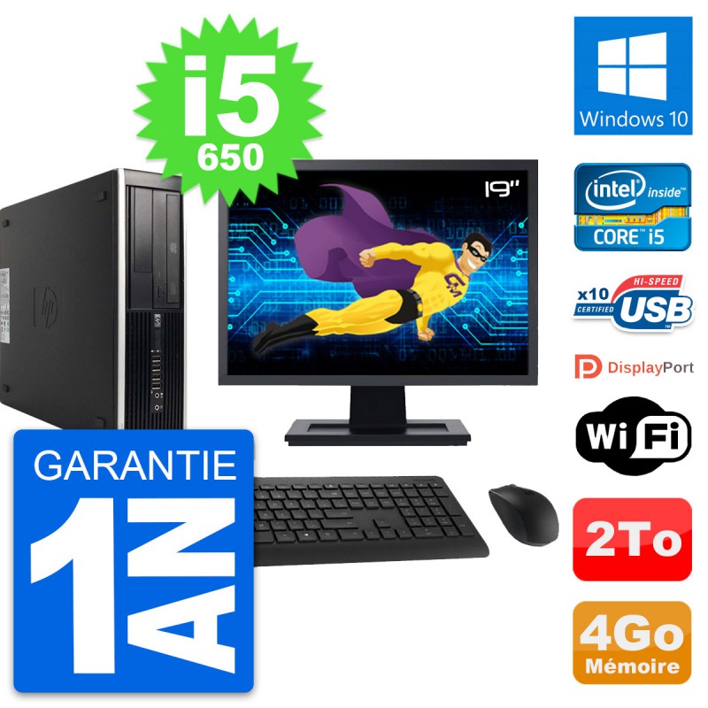 PC HP 8100 Elite SFF - Intel Core i5-650 3.2 Ghz (4 Mo) - 4 Go DDR3 - Disque Dur 3,5" 2 To - Graveur DVD - Clef Wifi USB - Windows 10 - Livré avec Ecran 19" + clavier + souris (Marques et modèles variables) - Garantie 1 an.
