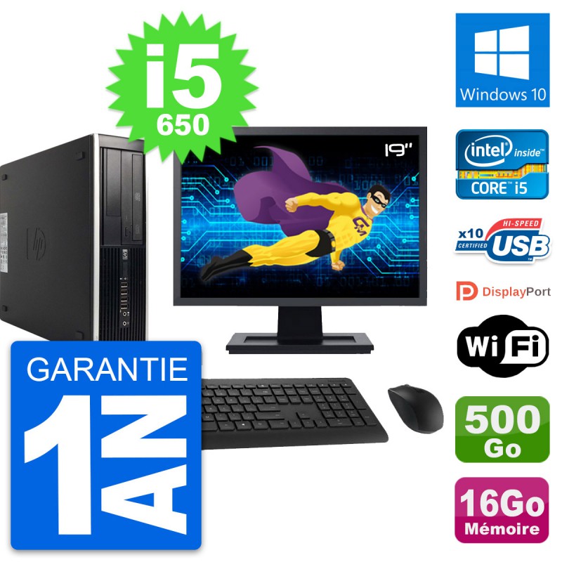 PC HP 8100 SFF Ecran 19" Core i5-650 RAM 16Go Disque 500Go Windows 10 Wifi