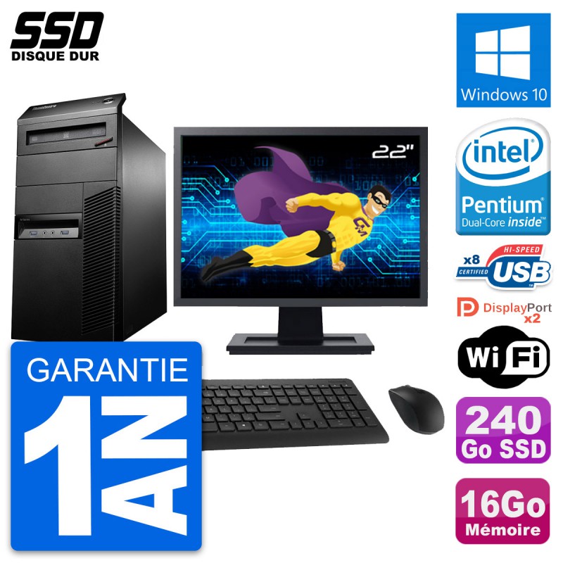 PC Tour Lenovo ThinkCentre M93p MT - Intel Pentium G3220 3.0 Ghz (3 Mo) - 16 Go DDR3 - Disque Dur SSD 240 Go - Graveur DVD - Clef Wifi USB - Windows 10 - Livré avec Ecran 22" + clavier + souris (Marques et modèles variables) - Garantie 1 an.