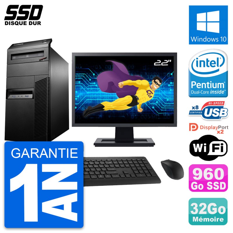 PC Tour Lenovo ThinkCentre M93p MT - Intel Pentium G3220 3.0 Ghz (3 Mo) - 32 Go DDR3 - Disque Dur SSD 960 Go - Graveur DVD - Clef Wifi USB - Windows 10 - Livré avec Ecran 22" + clavier + souris (Marques et modèles variables) - Garantie 1 an.