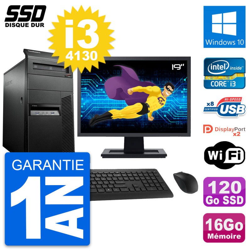 PC Tour Lenovo ThinkCentre M93p MT - Intel Core i3-4130 3.4 Ghz (3 Mo) - 16 Go DDR3 - Disque Dur SSD 120 Go - Graveur DVD - Clef Wifi USB - Windows 10 - Livré avec Ecran 19" + clavier + souris (Marques et modèles variables) - Garantie 1 an.