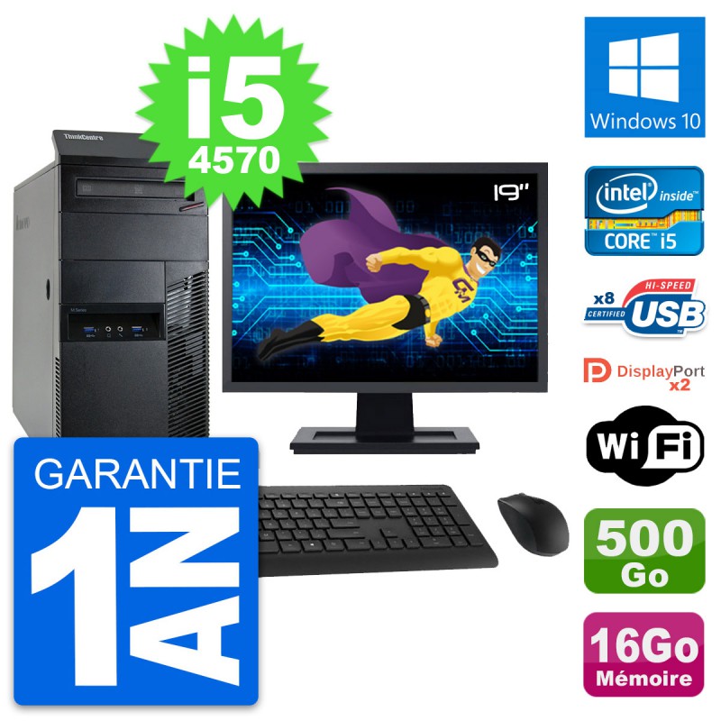 PC Tour Lenovo ThinkCentre M93p MT - Intel Core i5-4570 3.2 Ghz (6 Mo) - 16 Go DDR3 - Disque Dur 3,5" 500 Go - Graveur DVD - Clef Wifi USB - Windows 10 - Livré avec Ecran 19" + clavier + souris (Marques et modèles variables) - Garantie 1 an.