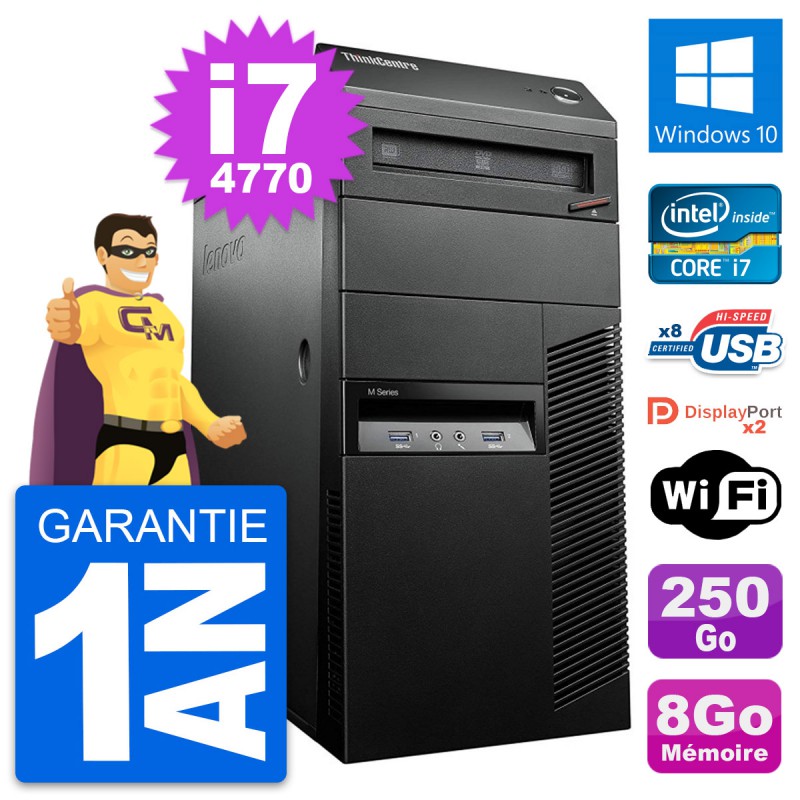 PC Tour Lenovo ThinkCentre M93p MT - Intel Core i7-4770 3.4 Ghz (8 Mo) - 8 Go DDR3 - Disque Dur 3,5" 250 Go - Graveur DVD - Clef Wifi USB - Windows 10 - Garantie 1 an.