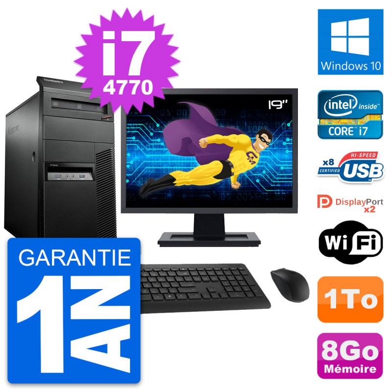 PC Tour Lenovo ThinkCentre M93p MT - Intel Core i7-4770 3.4 Ghz (8 Mo) - 8 Go DDR3 - Disque Dur 3,5" 1 To - Graveur DVD - Clef Wifi USB - Windows 10 - Livré avec Ecran 19" + clavier + souris (Marques et modèles variables) - Garantie 1 an.
