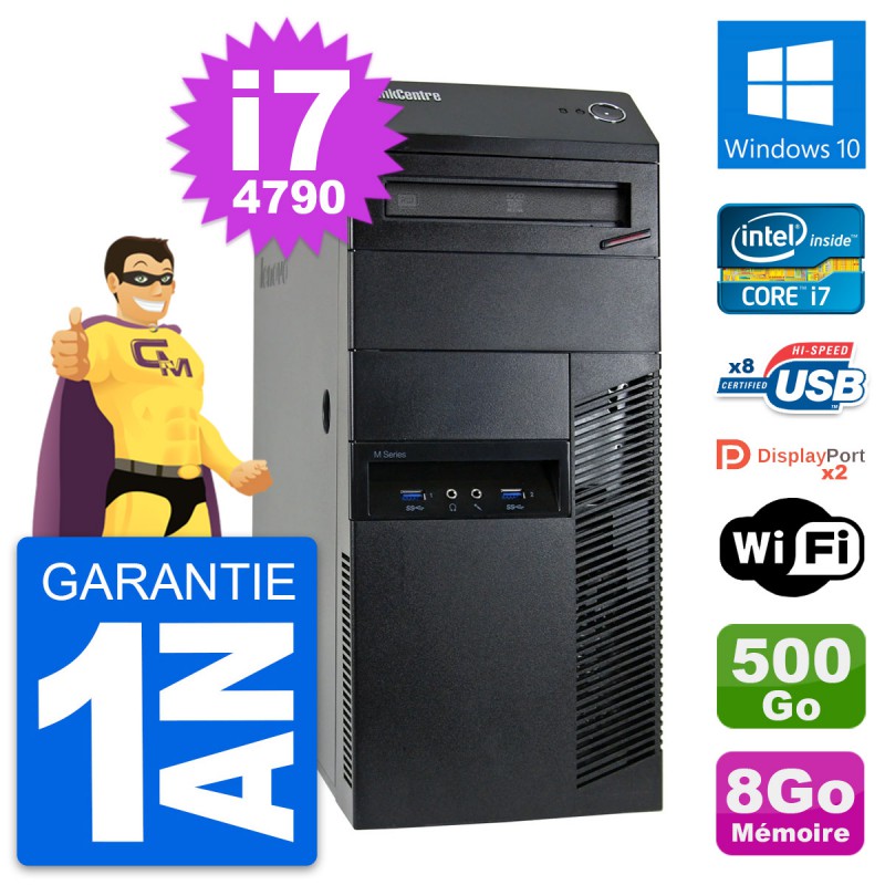 PC Tour Lenovo ThinkCentre M93p MT - Intel Core i7-4790 3.6 Ghz (8 Mo) - 8 Go DDR3 - Disque Dur 3,5" 500 Go - Graveur DVD - Clef Wifi USB - Windows 10 - Garantie 1 an.
