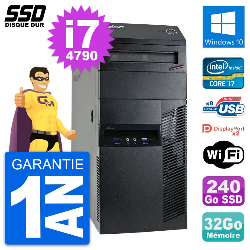 PC Tour Lenovo ThinkCentre M93p MT - Intel Core i7-4790 3.6 Ghz (8 Mo) - 32 Go DDR3 - Disque Dur SSD 240 Go - Graveur DVD - Clef Wifi USB - Windows 10 - Garantie 1 an.
